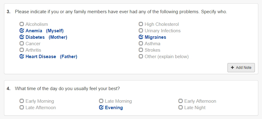 Z-Forms allows you to add notes (one per question) to an intake form after your patient has completed it.